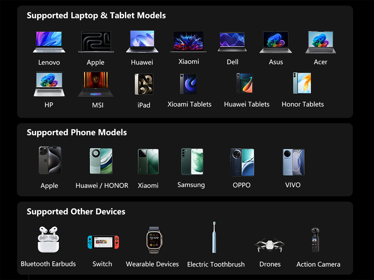 Built for modern devices, this 20000mAh power bank delivers genuine 100W fast charging, with full support for PD 3.0 and multiple fast-charge protocols. The built-in 70cm retractable USB-C cable supports up to 20V/5A (100W), making it powerful enough to charge USB-C laptops such as the MacBook Air (M3), as well as tablets and other high-performance electronics. In laboratory testing, it can charge a MacBook Air (M3) to 50% in just 30 minutes, giving you fast, reliable power when time matters.